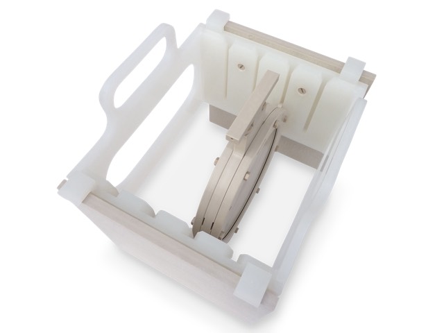 Each wafer is sealed by a double precision O-ring system that reduces mechanical stress on the wafer to a minimum. Two cover rings on the front and back side hold the wafers in place.